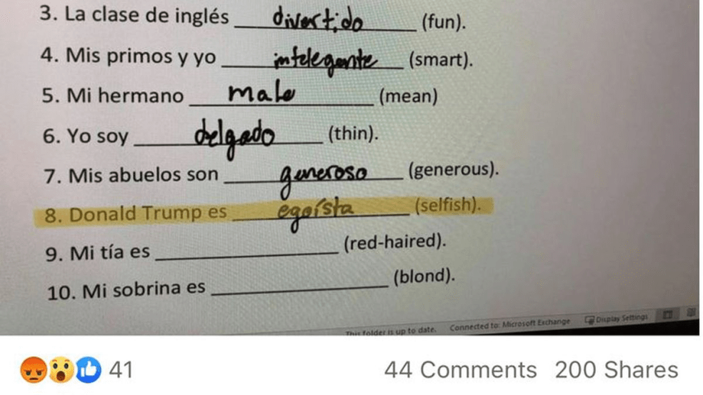 LA PRUEBA DE ESPAÑOL EN UN COLEGIO DE SECUNDARIA DE OHIO CALIFICA AL PRESIDENTE TRUMP COMO “EGOÍSTA”