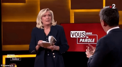 LA LÍDER DE EXTREMA DERECHA FRANCESA MARINE LE PEN SE QUEDA ATÓNITA CUANDO EL MINISTRO DEL INTERIOR DEL PRESIDENTE MACRON LA ACUSA DE SER DEMASIADO BLANDA CON EL ISLAM EN EL DEBATE ELECTORAL