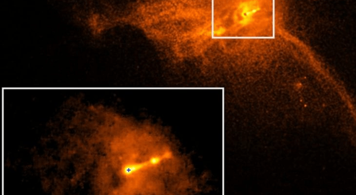 ¿Entonces? La gravedad de ANSFi – y de cualquier agujero negro – deforma el tejido del espacio tiempo y hace una “sombra circular” que delimita al propio agujero negro. La parte anaranjada es una nube de gas incandescente calentándose mientras cae en el horizonte de sucesos.
