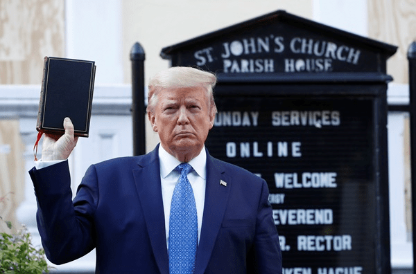 En la foto lo vemos sosteniendo una Biblia mientras visita por fuera la Iglesia de San Juan, al otro lado del Parque Lafayette. Parte de la iglesia fue incendiada durante las protestas del domingo por la noche.