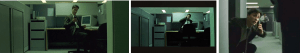 Morfeo por fin contacta con Neo a través de un teléfono móvil que le hace llegar por correo certificado a su lugar de trabajo. Antes de esta secuencia el jefe de personal de la empresa le ha llamado a su despacho. No es la primera vez que llega tarde. De hecho, todos los días llega tarde. El jefe de personal intenta explicarle lo orgulloso que debería sentirse de trabajar en esa empresa. Pero Neo mira por la ventana –ve a dos empleados limpiando los cristales, y ese a modo de susurro del jefe de personal no logra penetrar en su corazón ni hacer mella en su ánimo.
