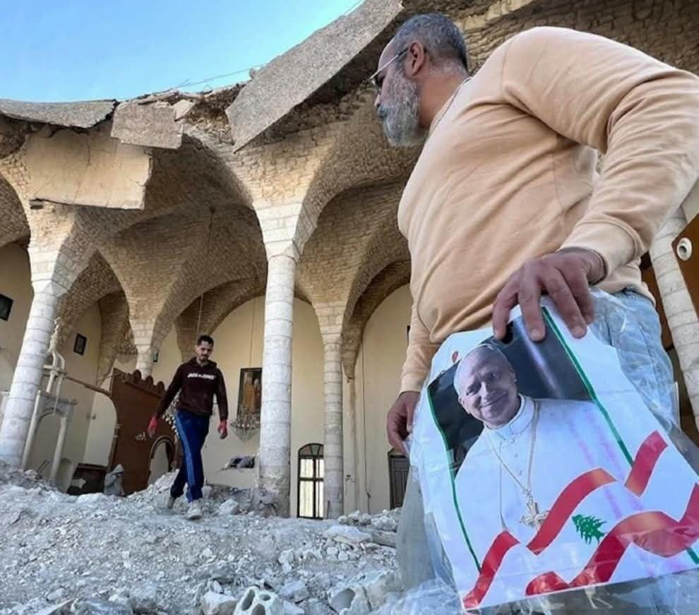 “En la ciudad de Derdghaya, al sur del Líbano, un lugareño se subió a las ruinas de lo que fue la iglesia del pueblo, diezmada por el Israel sionista, colgando con cariño fotos del Papa y banderas del Vaticano. Explicó que deseaba que el «Santo Padre» visitara el sur, una región que ha pagado con sangre y escombros más de lo que nadie parece dispuesto a reconocer. Pero seamos sinceros: el Papa no tiene prisa por pisar el sur del Líbano. ¿Y qué hay de los funcionarios libaneses que le extienden la alfombra roja en Beirut? Desde luego, no lo están llevando por los puestos de control para mostrarle la destrucción ni a las personas que realmente necesitan un gesto espiritual. Así que los habitantes hicieron lo que pudieron: decoraron los escombros como una bienvenida simbólica, conscientes de que lo único que los visitaría pronto sería más indiferencia. (Marwa Osman/MidEaStream)