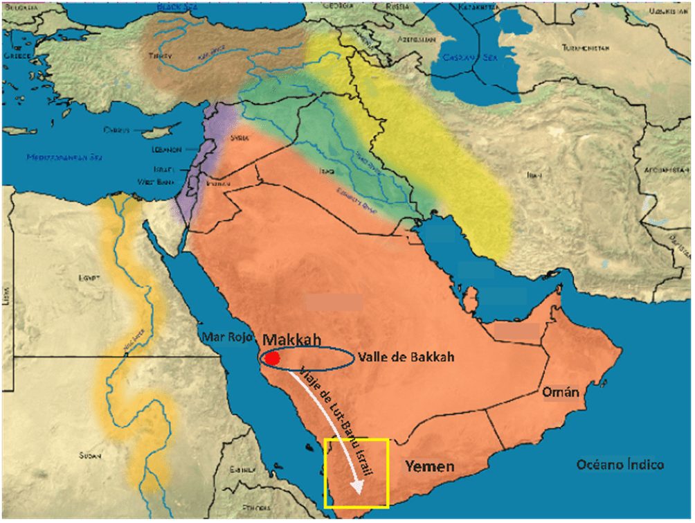 A Lut se le ordena “salir de noche”. En realidad, es una huida porque las vidas tanto de Lut como de los que le siguieron estaban en peligro. Lógicamente, no se les ordena ir a la deriva. No se trata solamente de escapar del castigo que al amanecer caerá sobre esa ciudad, sino de ir a un lugar concreto con una misión específica. Lut abandona el Valle de Bakkah y se dirige a Yemen, al otro extremo del eje profético, al inicio, al lugar donde dio comienzo la historia del Insan. Cuando Lut llega a Yemen, se instala en Misr, donde se le da el sobrenombre de Isra-il, “el que ha viajado de noche por Allah”, y a los que le acompañan se les denominará “los Banu Isra-il”, “la gente que va con Lut”, “la gente que le sigue”. Ibrahim e Isma-il, por su parte, se quedan en el Valle de Bakkah, donde mantendrán el Tawhid hasta la llegada del sello de la Profecía, Muhammad. Mientras tanto, se lanza otra línea profética. La historia se va a centrar ahora en Misr y en los Banu Isra-il, a los que un día llegará Musa (Moisés) con un importante mensaje del Creador.
