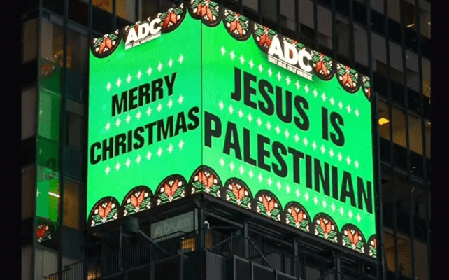 El 24 de diciembre de 2025 el New York Post publicaba un artículo titulado “Un incendiario cartel en Times Square que proclamaba ‘Jesús es palestino’ fue criticado por turistas: ‘Un mensaje divisivo’ (Inflammatory Times Square billboard proclaiming ‘Jesus is Palestinian’ slammed by holiday tourists: ‘A divisive message’).
