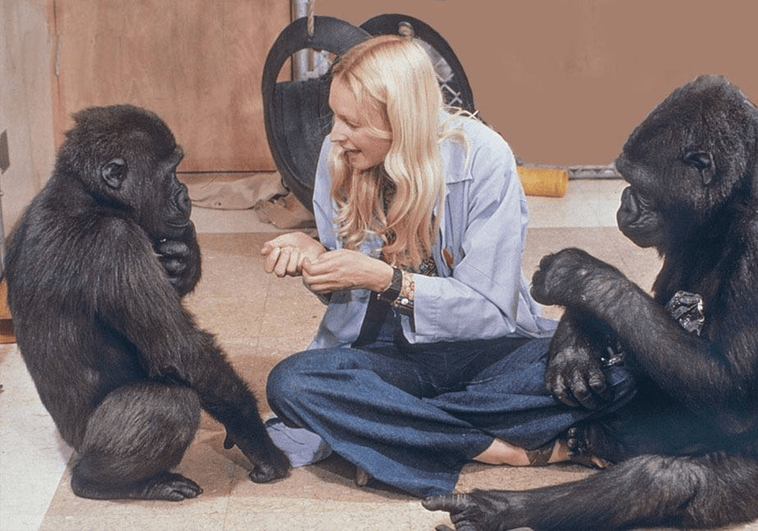 Orangutanes, bonobos, gorilas y chimpancés podrían ver ampliados sus derechos próximamente por ser «los animales con una mayor proximidad genética» al hombre. En la foto: la doctora Francine Patterson, la primera en enseñar a Koko, una hembra de gorila, a expresarse en el lenguaje de signos.