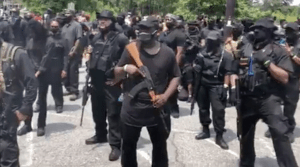 MANIFESTANTES NEGROS FUERTEMENTE ARMADOS CAMINAN POR EL PARQUE STONE MOUNTAIN EN GEORGIA