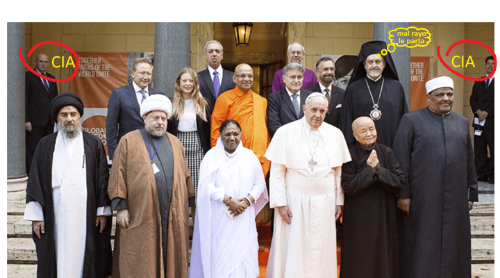 Para que esta infamia pueda tener visos de cierta legalidad espiritual, la CIA ha acuñado una ocurrente lista de lemas con los que salvar las insidiosas recriminaciones de los creyentes. Así hablan los musulmanes: “Debemos distinguir entre los judíos sionistas y los judíos religiosos que son pro-palestinos y se sienten nuestros hermanos. Nosotros sólo nos sentamos a dialogar con los segundos”. O dicen: “Hay mucha hikmah en el yoga y en la meditación budista. A través de estos ejercicios intentan estos monjes llegar a la unidad con el Absoluto –como nosotros”. A veces se les caen las lágrimas cuando oyen argumentos del tipo: “Sabemos que hay cristianos fundamentalistas cuya radicalización les tiene cegados a la verdad, pero nosotros sabemos que hay un solo Dios, aunque haya tres. ¡Ya ven! Un curioso y molesto misterio que no hay por qué enarbolar ni hacer de él piedra de escándalo ni motivo de discordia. Dejemos el misterio aparte y abracémonos en el cuerpo de Cristo. ¿No? ¿Sí? Sí… sí, yo también os amo.” Patético.