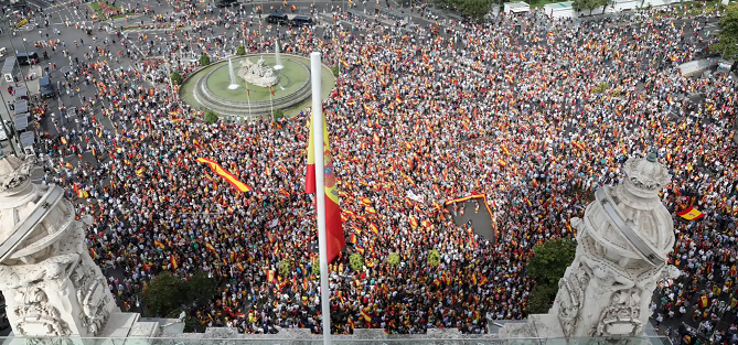 Una hora antes del inicio de la manifestación la Plaza de Cibeles de Madrid comenzó a llenarse. Miles de banderas de España ondeaban en las manos de los participantes, y también a modo de capa o sombrero. Un cartel dejaba constancia de un Pedro Sánchez con la nariz de pinocho junto a un “¡¡¡¡Basta ya!!!! Gobierno, traidor”. De fondo, sonaba el “Resistiré” del Dúo Dinámico que acompañó, a modo de “himno” el confinamiento durante la pandemia y que hoy, junto a “Mi querida España” se sumaba a la indignación de la sociedad civil.