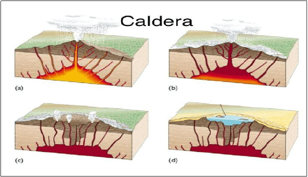 Una caldera es una formación volcánica que resulta del colapso, podemos decir, de un volcán sobre sí mismo, produciendo una forma especial de cráter volcánico. El desplome de la caldera generalmente se desencadena por el vaciado de la cámara de magma debajo del volcán tras una serie de grandes erupciones volcánicas. Si sale a la superficie suficiente magma, la cámara magmática, prácticamente vacía, no podrá soportar el peso de la estructura volcánica (la montaña). Las fracturas se formarán alrededor del borde de la cámara, generalmente en una forma más o menos circular. Estas fracturas de anillo pueden, de hecho, servir como respiraderos volcánicos. A medida que la cámara de magma se vacía, el centro del volcán dentro de las fracturas del anillo comienza a colapsar. El desplome puede ocurrir como resultado de una sola erupción masiva, o puede ocurrir en etapas como resultado de una serie de erupciones. La superficie total de la parte colapsada puede ser de cientos o de miles de metros.