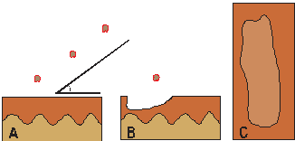 Como vemos en el esquema A, ese podría ser un probable ángulo, e incluso aún menor, de penetración. En el esquema B el meteorito penetra en la tierra siguiendo la inclinación que marca el ángulo en el esquema A. En el esquema C vemos una posible representación, vista desde arriba, de la forma final de la depresión que produciría el meteorito. Muy probablemente, sería mucho más irregular y caótica que la del esquema C. Sin embargo, en ninguna foto de cráteres supuestamente originados por meteoritos aparece una forma similar a la del esquema C. Todas son circulares, como dibujadas con un compás.