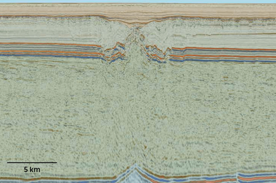 El geólogo Uisdean Nicholson de la Universidad Heriot-Watt en Edimburgo encontró la estructura mientras analizaba los datos recopilados por ondas sísmicas transmitidas bajo tierra para detectar estructuras físicas en alta mar de Guinea. Acechando bajo el lecho marino, y bajo casi 1 kilómetro de agua, distinguió una estructura en forma de cuenco con un piso en terrazas rotas y un pico central pronunciado, características que se esperan de un gran impacto.